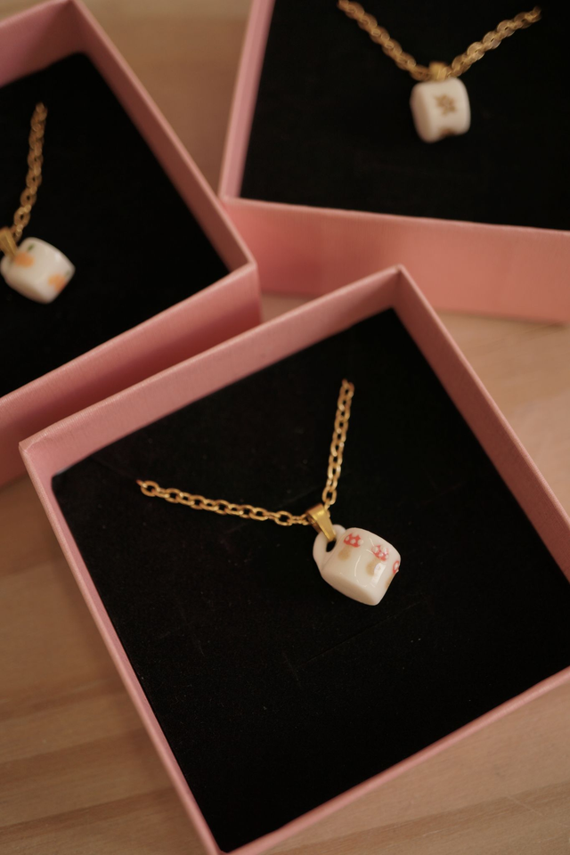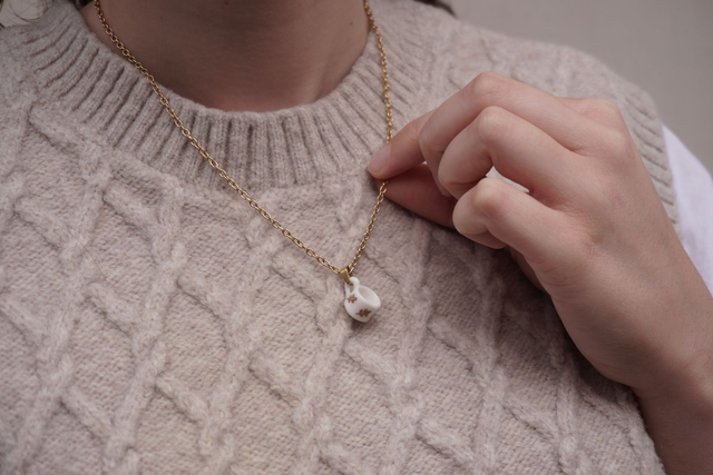 Inspiré des promenades en forêt, ce collier met en avant une mini tasse en porcelaine que j’ai tournée et décorée de feuilles aux couleurs chaudes.